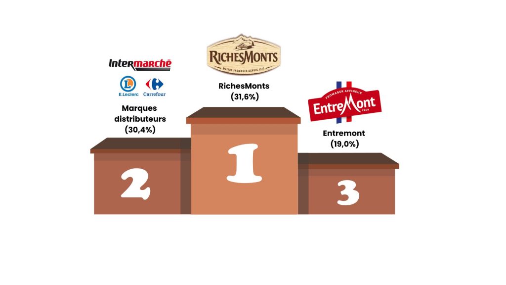 Les 3 marques que les consommateurs préfèrent acheter sont RichesMonts (31,6%), les marques distributeurs (30,4%) et Entremont (19,0%). 9,5% des répondants achètent leur fromage directement chez un fromager. La majorité des achats s’effectue en supermarché ou hypermarché (91,1%). Loin derrière se trouvent les magasins de proximité (9,8%), le hard discount (14,5%), le fromager/crèmerie (14,8%), le drive (3,9%) ou le marché (4,2%).
